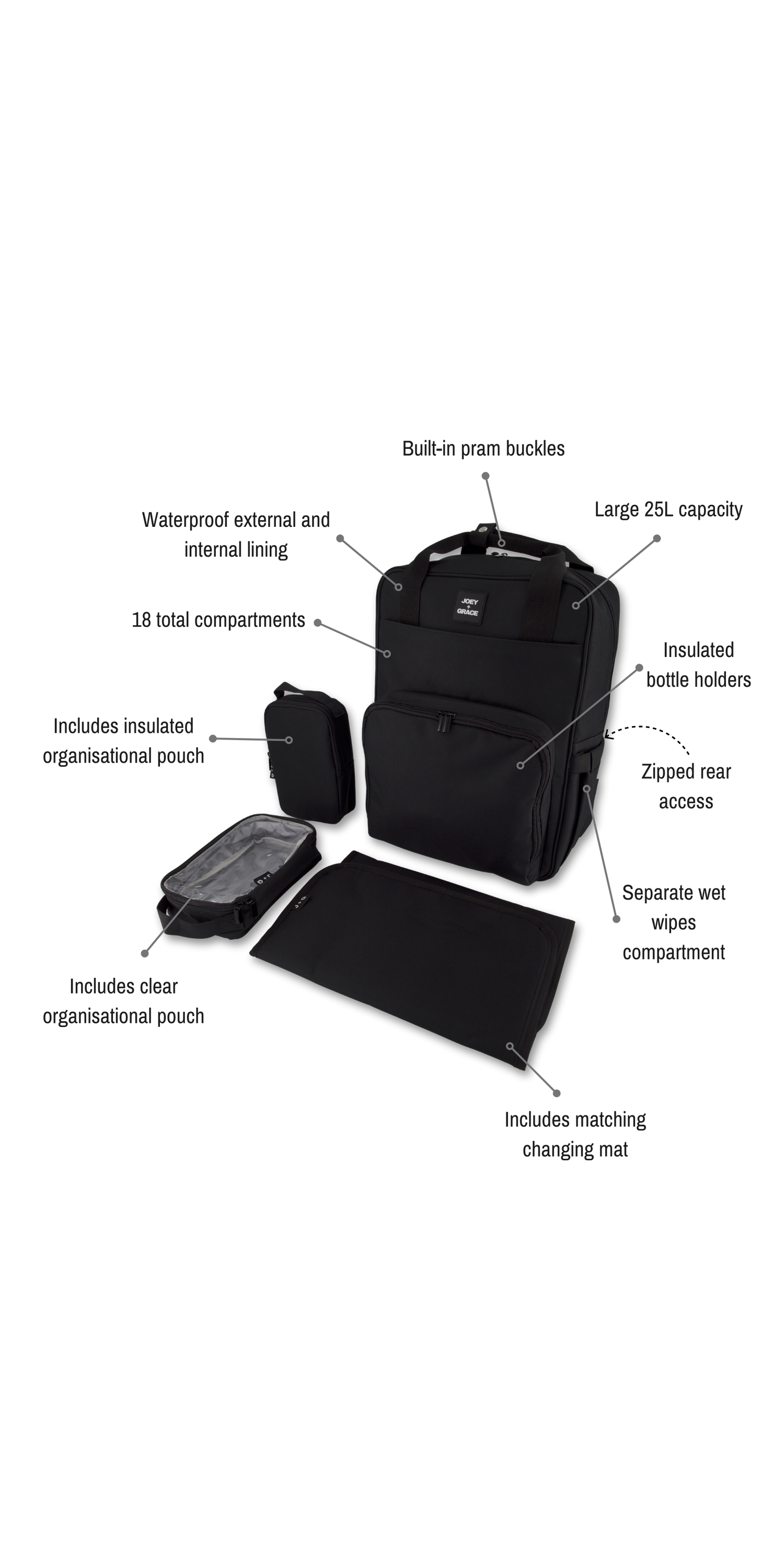 As parents, we understand the challenges of raising a baby. Joey and Grace provides functional and reliable nappy bags as a symbol of our commitment to support parents. Our bags are spacious, waterproof, and organized so you can focus on what really matters - to create more beautiful memories with your children.